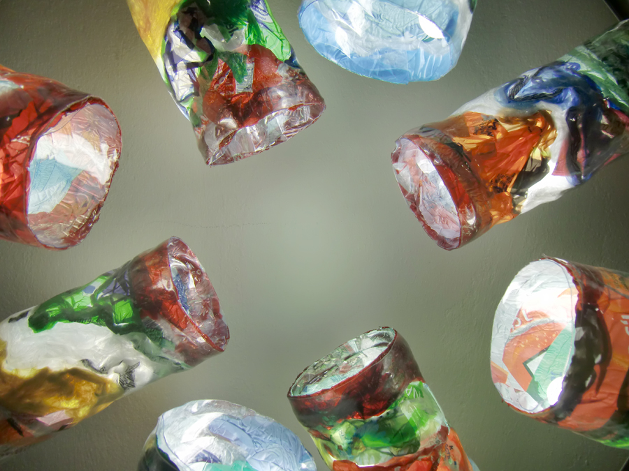 Der Great Pacific Garbage Patch rotiert zwischen Nordamerika und Asien. Dabei zirkulieren Millionen Tonnen Kunststoffmüll in einem großflächigen Strudel. Durchmesser 130cm, Leuchtmittel, PET-Flaschen, Plastiksackerl, Stahlblech. 2012